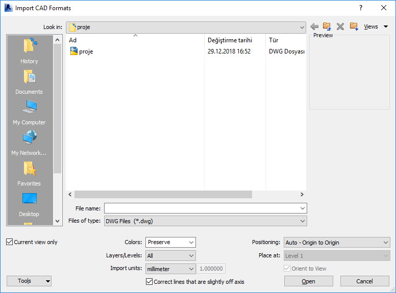 -Layers/Levels: Revit içerisine gelecek layerler seçilir.