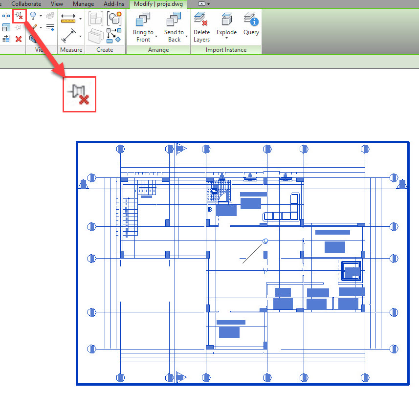 Plan yerinden oynamaması ya da istenmeden herhangi bir değişikliğe uğramaması için Revit’e kilitli bir şekilde import edilir. Bu kilidi kaldırmak için plana bir kere tıklanır, Modify sekmesinden Unpin komutu kullanılır.