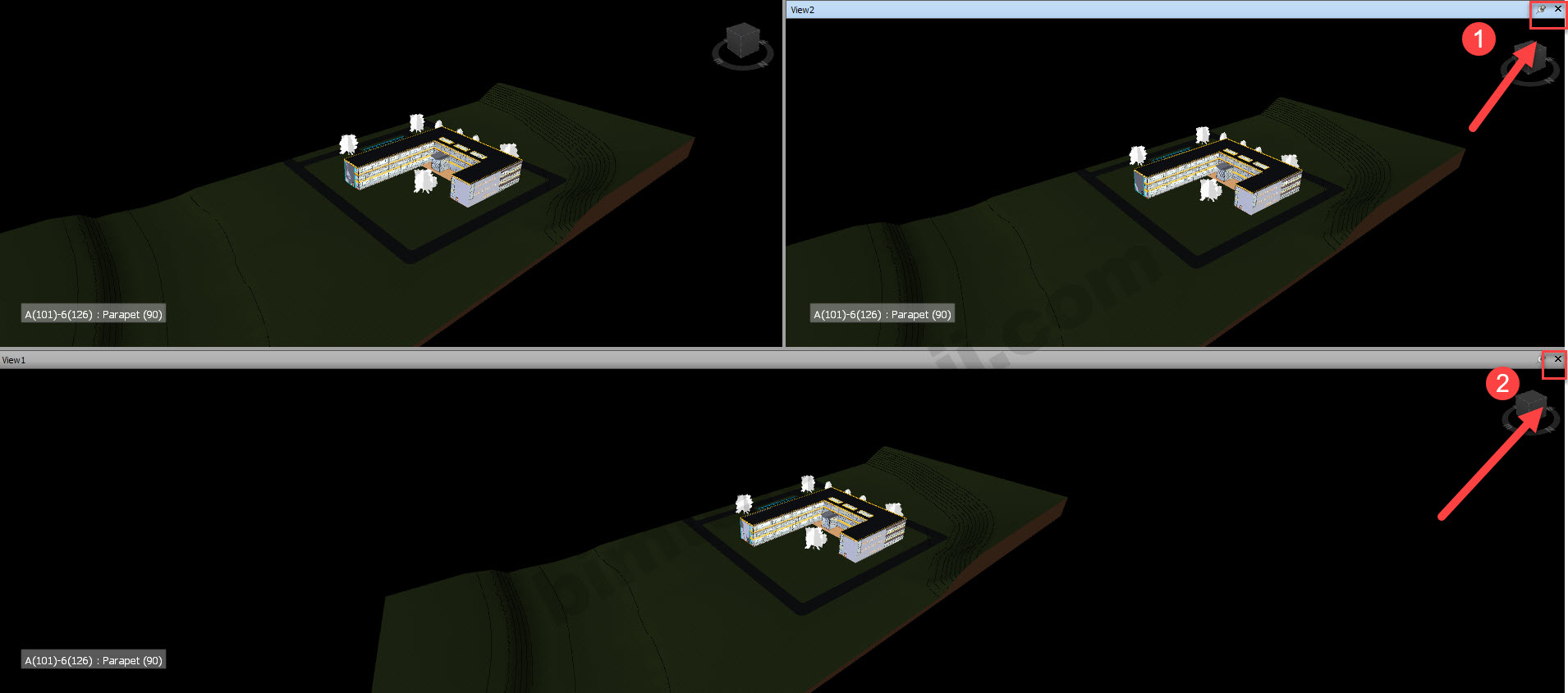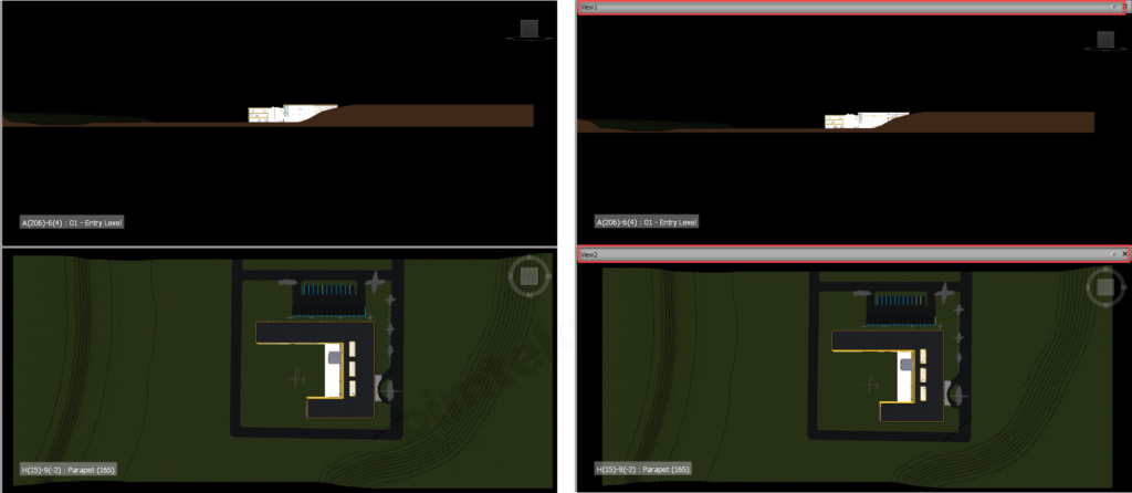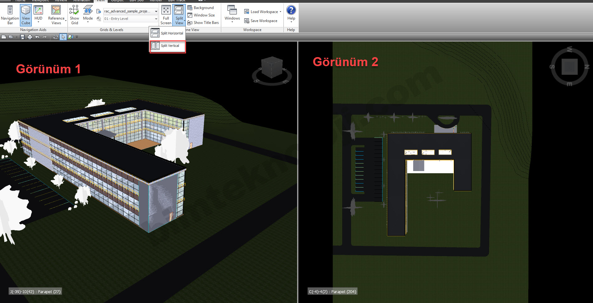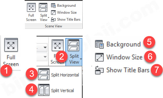 Navisworks de, ekran görünüm ayarları View sekmesindeki, Scene View kısmından yapılır. Tam ekran görünüm ya da ekranın bölünerek farklı açılardan modele bakılmasının sağlanması bu kısımdan ayarlanır.