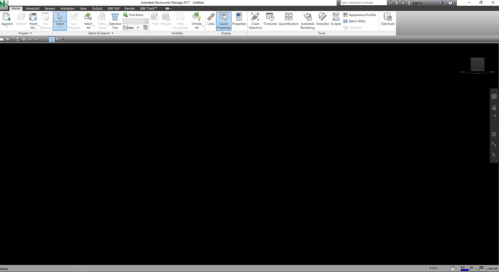 Navisworks yazılımını ilk açtığınızda karşınıza boş bir ekran çıkacaktır. BIM modelleme yazılımlarında olduğu gibi, herhangi bir aks sitemi, proje orijin noktası, cephe görünümleri vb. seçenekler olmayacaktır. Bunun sebebi için, Navisworks bir modelleme yazılımı değil, koordinasyon yazılımı olmasından kaynaklı diyebiliriz. Başka yazılımlarda oluşturulmuş farklı dosya formatlarını Navisworks’e eklenerek çalışmalar yapılır.