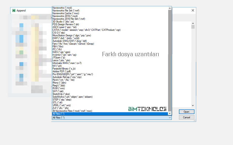 - Append komutu seçildiğinde, eklemek istediğiniz dosyaları seçeceğiniz ekran açılacaktır. Navisworks’e, çok sayıda farklı dosya formatında oluşturulmuş çizimleri ekleyebiliriz.