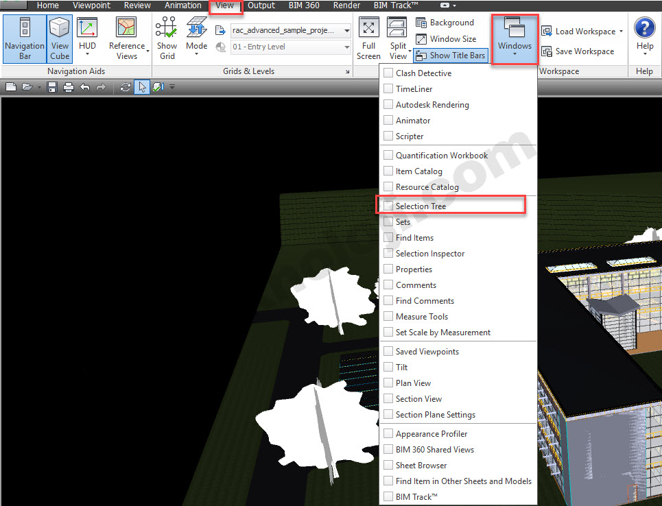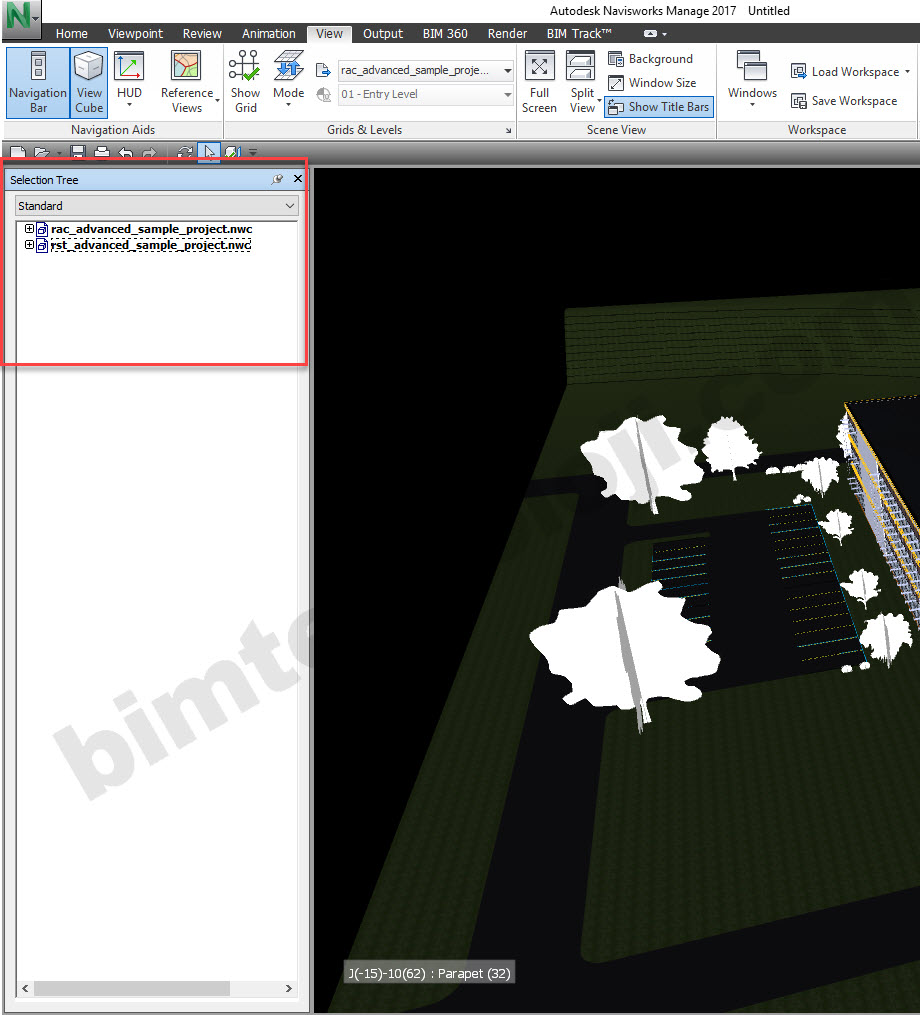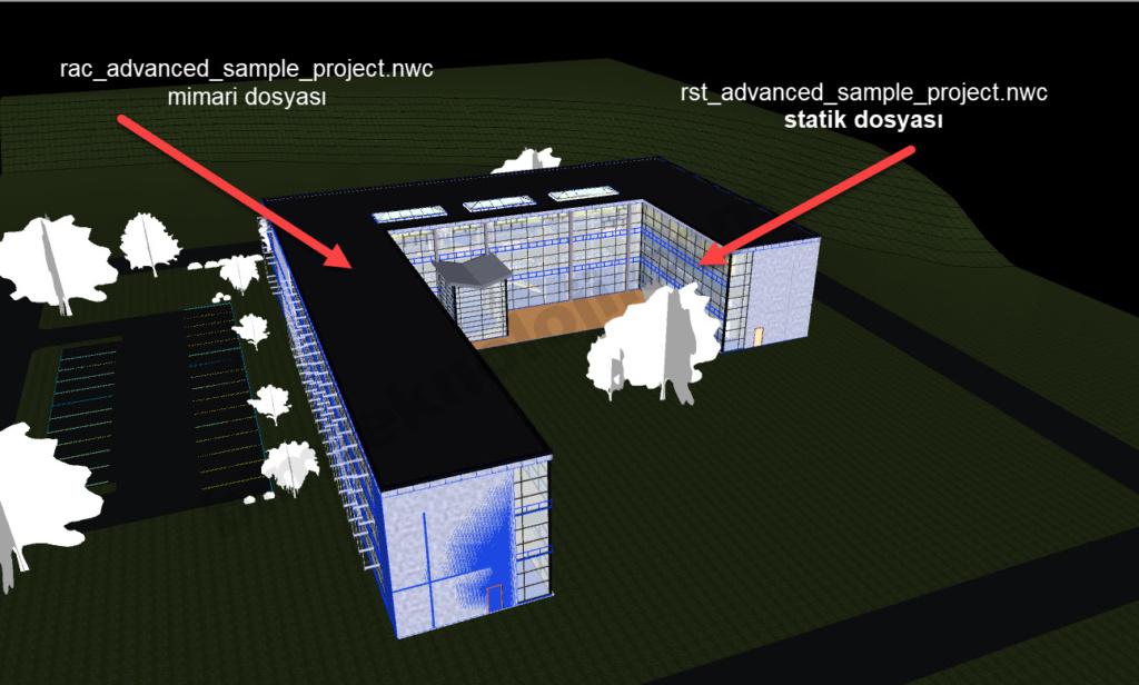 Bu örnek de, Autodesk Revit’in örnek klasöründe (sample klasöründe) bulunan dosyaları kullanacağız. Mimari dosya için, ‘ rac_advanced_sample_project.nwc’ statik dosyası için, ‘rst_advanced_sample_project.nwc’ dosyalarını ekleyeceğiz.
