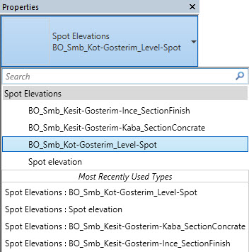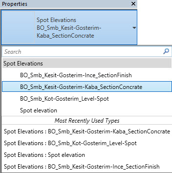 Properties penceresinden uygun tip seçilir. Kesitte ayni hizada gösterilen kot sembolleri çiziminizi grafiksel anlamda güçlendirerek görsel etkiyi artıracaktır.