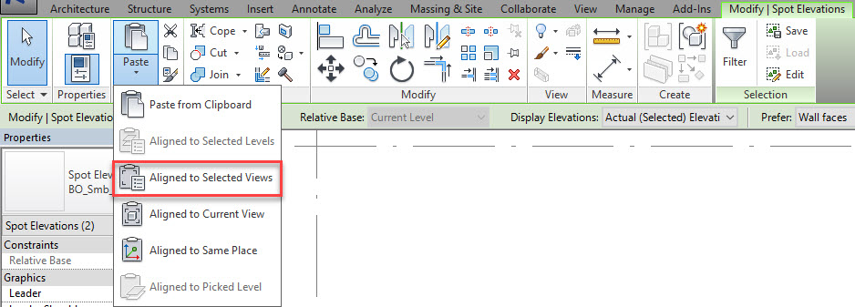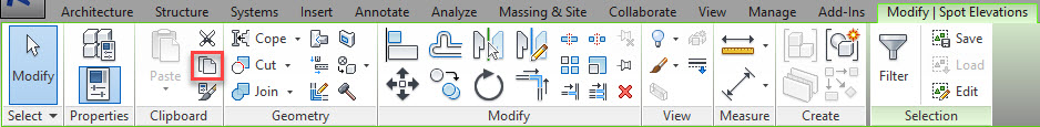 Mevcut kotları başka katlara aynı hizada kopyalamak mümkündür. Bunun için kopyalanmak istenilen kotlar seçilir ve Modify sekmesinden Copy to Clipboard komutu ile kopyalanması istenilen kot sembolleri seçilir.
