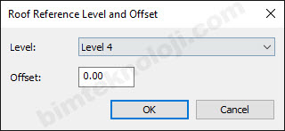 1. Roof Reference Level and Offset iletişim penceresi açılır. Çatının referans seviyesi belirlenir ve Offset (öteleme) uygulamaya olanak sağlar. Projedeki en yüksek seviye varsayılan olarak seçilir.