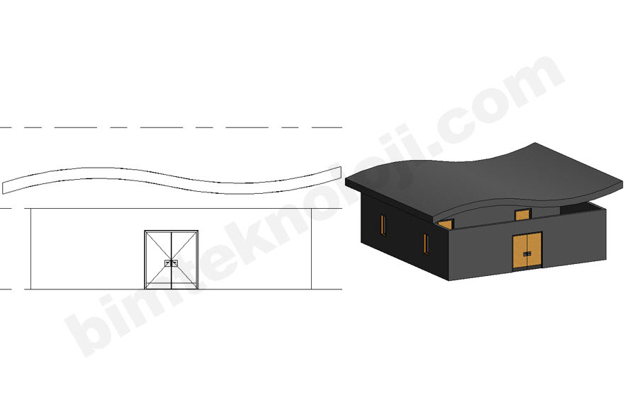 Revit’te çatı oluşturmak için, Roof by Footprint, (Ayakizi ile çatı) Roof by Extrusion, Roof by Face (yüzeye göre çatı) olmak üzere 3 seçeneğimiz vardır. Roof by Extrusion seçeneği ile çatı modeli, kesitinden modellenir. Çatı kesiti, tek doğrultuda uzatılarak çatı modeli oluşturulur. Kavisli çatı çizimleri için kullanılabilinir.