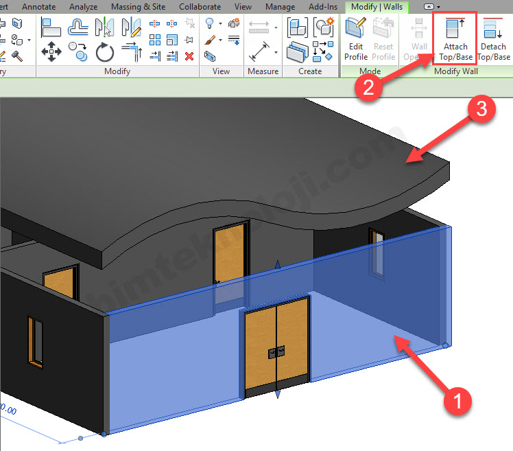 1. Çatı ile birleşmeyen duvarlar var ise, duvarı seçip Modify panelinden Attach Top/Base komutu ile birleştirilir.