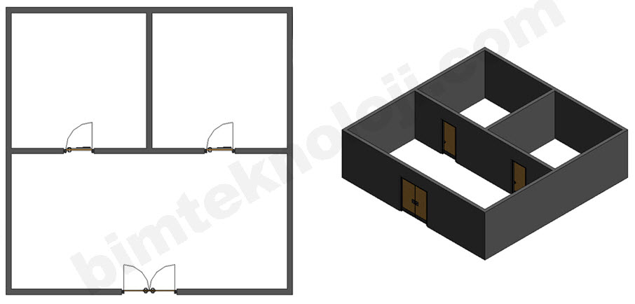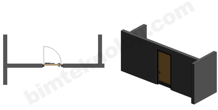 Revit’te kapılar duvarlar üzerinde yerleştirildiği vakit, gereken kapı boşlukları program tarafından otomatik açılır. Böylece kapı boşluğu açmak için herhangi bir ek işlem yapılmasına gerek yoktur. Bu işlem kapının yerinin değiştiğinde ya da kapı iptal edilerek silindiğinde de devam eder. Metraj işlemlerinde kapı boşlukları ilgili metraj toplamlarından çıkarılmış olur.