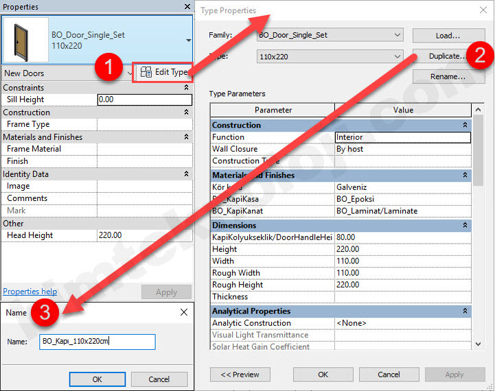 1. Mevcut kapı tipini çoğaltmak için, Edit Type komutuna tıklanır, açılan Type Properties penceresi altında Duplicate ile yeni kapı tipi isimlendirilerek oluşturulabilir. Örneğin;