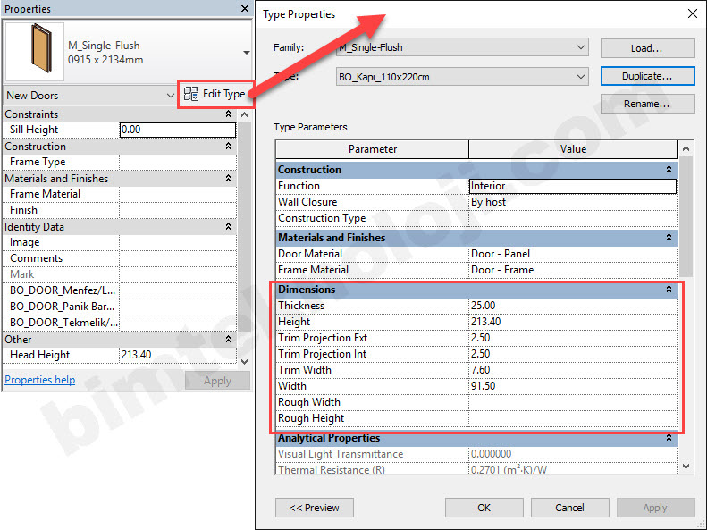 1. Oluşturulan kapı tipinin ölçüleri, Edit Type komutuna tıklanır. Type Properties penceresinden Dimensions başlığı altından düzenlenebilir. Thickness ile kapı kanat kalınlığını, Height ile yükseklik, Width ile genişlik değerlerini ayarlayabiliriz.