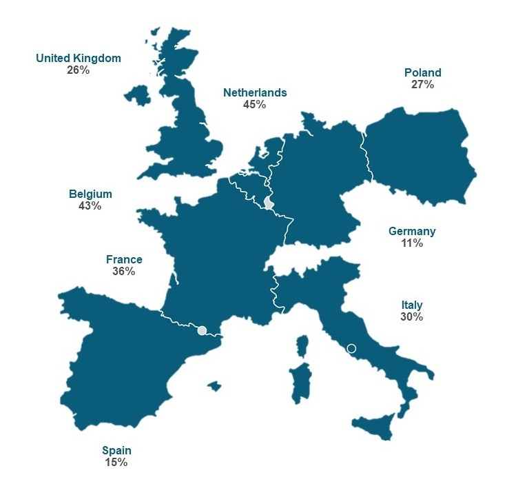 Mevcut araştırmamız, BIM kullanmaya katılan tarafların ülkelere göre de değiştiğini göstermektedir. Örneğin, üstteki resimde de görüldüğü gibi, ana yüklenicinin BIM modelini kullanmaya aktif olarak katıldığı BIM ile ilgili projelerin payı Almanya’da sadece % 11 iken Belçika ve Hollanda’da % 43 ve % 45 arasında değişmektedir. Mimarlar, tüm Avrupa ülkelerinde BIM ile ilgili projelerin çoğunda, kullanılan BIM modellerinin doğruluğunu güncellemede ve kontrol etmede hala liderdir. Bununla birlikte, Hollanda ve Belçika’yı yakından incelediğimizde rollerdeki bir değişim ortaya çıkıyor.