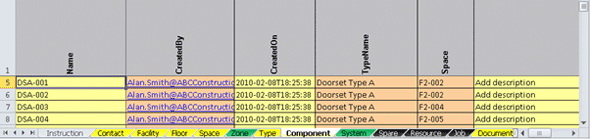 Bir COBie dosyası tam bir BIM uygulaması değildir, ancak inşaat ekibinin tüm üyelerinden ve aşağıdaki ekran görüntülerinde gösterildiği gibi birçok bilgi modelinden yapılandırılmış içerikleri kapsar. Şekil 7, binayı oluşturan katları, boşlukları ve bölgeleri tanımlayan çalışma sayfalarından birini göstermektedir. Zeminlerde boşluklar olabilir. Bu bilgi tipik olarak tasarım modelinden çıkarılır.