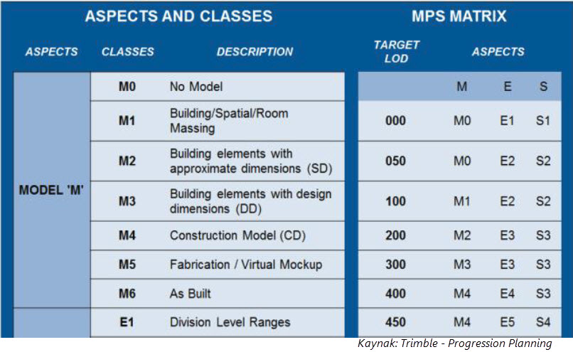 Yazının ilk bölümünde bahsedildiği üzere, BIM Standartları alt başlıklarında olan, Model İlerleme Matrisleri, BIM modellerinin projenin hangi aşamasında, hangi detaylar ve özelliklerde yapılacağını tanımlayan tablolardır. LOD (Level of Development) seviyeleri ile, model elamanlarının detay seviyeleri tanımlanır, modelin içermesi gereken geometrik ve metin içerikli bilgi datalarının seviyelendirilmesi yapılır. Model ilerleme matrisleri/şartnameleri gelişmiş LOD bilgilerini içeren dokümanlardır.