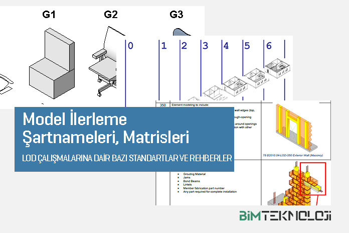 Yazının ilk bölümünde bahsedildiği üzere, BIM Standartları alt başlıklarında olan, Model İlerleme Matrisleri, BIM modellerinin projenin hangi aşamasında, hangi detaylar ve özelliklerde yapılacağını tanımlayan tablolardır. LOD (Level of Development) seviyeleri ile, model elamanlarının detay seviyeleri tanımlanır, modelin içermesi gereken geometrik ve metin içerikli bilgi datalarının seviyelendirilmesi yapılır. Model ilerleme matrisleri/şartnameleri gelişmiş LOD bilgilerini içeren dokümanlardır.