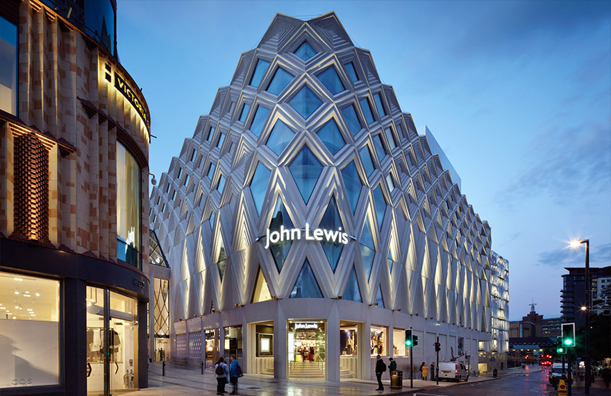 John Lewis binası, kısmen kentin tekstil mirasından ilham alan beyaz terakota ve kırmızı tuğla karışımından yapılmış çarpıcı bir cepheye sahip. Ayrıca galerilerde karmaşık tuğlalar ve karmaşık kıvrımlı geometrik cam tavanlar bulunuyor.