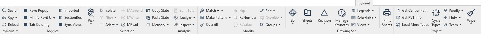 Pafta ayarları, Pafta revizyonları, Baskı ayarları, Modele eklenmiş dosyaları görme, CSV formatlı tablo alma ve aktarma, Pattern tanımlama, yeniden numaralandırma özellikleri ve daha pek çok çalışmaları hızlandırıcı ve kolaylaştırıcı komutlar içeren pyRevit, mutlaka incelemeniz gereken eklentilerden biridir.
